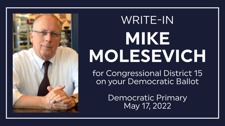 Mike Molesevich of Lewisburg, Union County, asks for your vote as the Democratic candidate for the PA 15th Congressional District on Tuesday, May 17. Our goal is more than 1,000 eligible write-in votes. There currently is NO Democratic Candidate for the PA-15 Congressional Election.