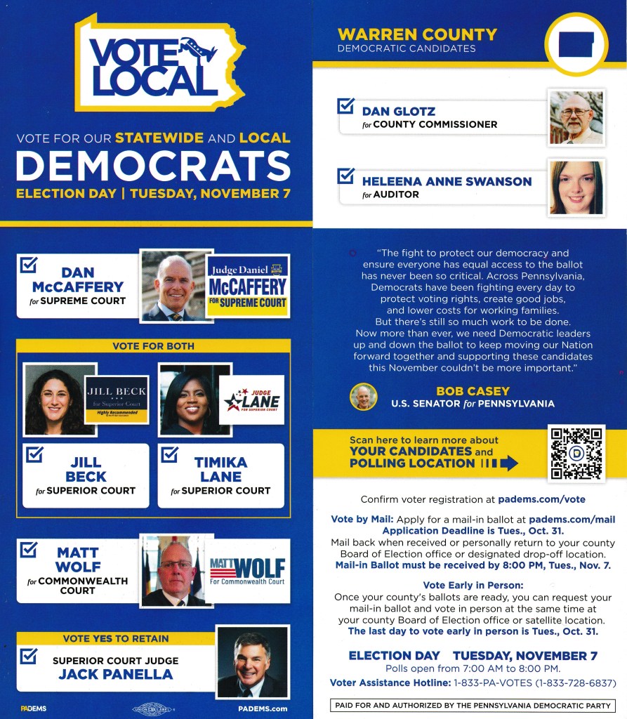 Glotz, who lives in Conewango Township with his wife, Sandy, emphasized three specific priorities he would have as commissioner – broadband internet expansion, the expansion of tourism and recreation opportunities as well as utilizing “pro-business ideas and work to attract new businesses to Warren County and support those we have.” We hope to see you out on November 7, 2023 supporting Dan.